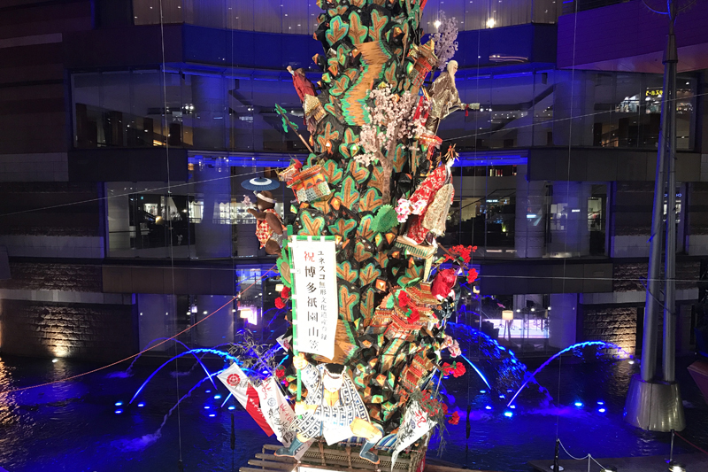 山笠の盛り上がりも最高潮に。ドン!という和太鼓の音と共に「山笠」の二文字が浮かびあがり、会場に手一本が入ります。上映は約4分弱。山笠期間の夜をいろんなフロアのいろんな角度からこの「YAMAKASA」をを楽しんで見てはいかがでしょうか。
