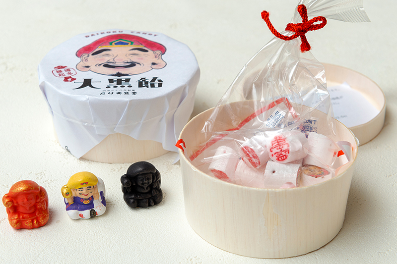 飴の断面には大黒天と萬盛堂のふたつの絵柄が描かれれており、口に入れると昔ながらの甘さが口の中に広がります。