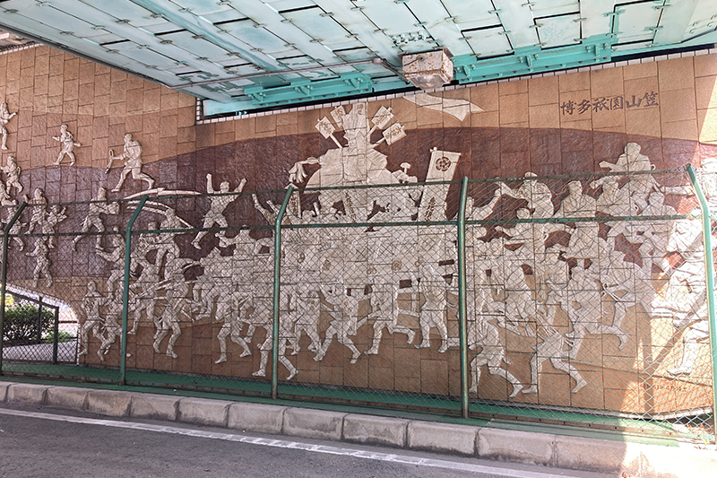 この呉服町ランプの橋脚を潜ると、その壁に見事な恵比須流の勇壮な山笠レリーフが飾られています。