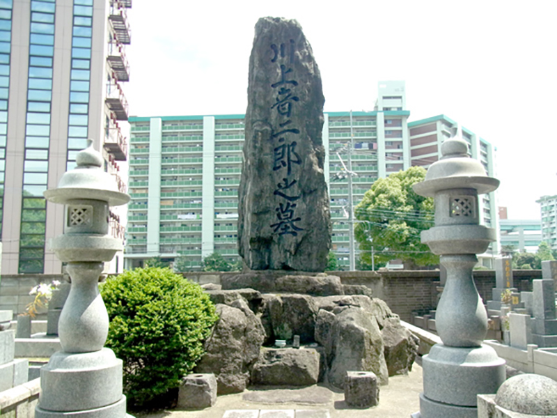 音二郎は1911年(明治44年)大阪の舞台で倒れ死去。「若い役者が上京するのを見ていたいので汽車が眺められるところに」という音二郎の遺言により、博多駅(当時は祇園町辺りにありました)が近くにあった承天寺に葬られました。今も承天寺の墓地に、その墓碑は今もなお立派に建っています。