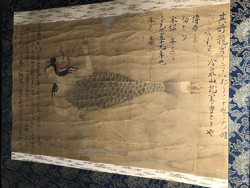 龍宮寺には「人魚の骨」と言い伝えられている骨と、江戸時代に描かれた人魚の掛け軸が寺宝として秘蔵されています。江戸時代にはこの人魚の骨を霊験あらたかなものとして扱い、縁日には水を張ったタライに入れて、不老長寿や無病息災の祈願のために参拝者にふるまっていたといいます。