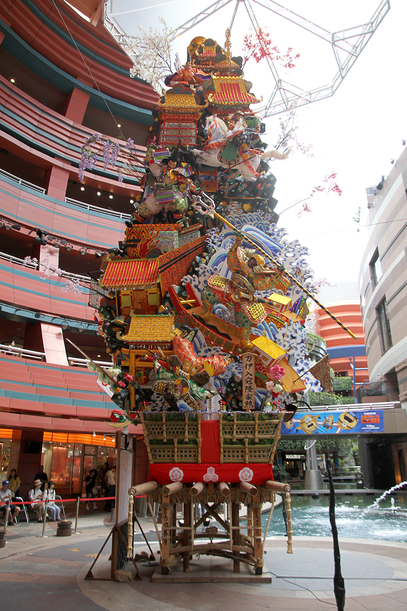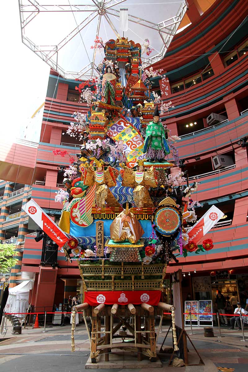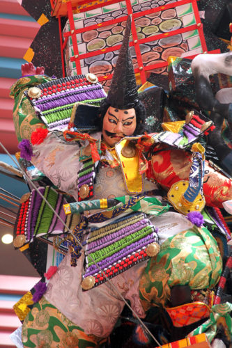 飾り山笠の両脇には、博多織デベロップメントカレッジの生徒の皆様が制作した、国の伝統工芸品博多織の献上柄を飾り付けています。