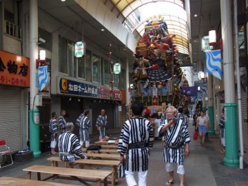天気がよい事もあって、上川端商店街のアーケードの天井を開け、走る飾り山の天辺部分を伸ばしてからの御神入れを行い、とても開放感溢れる神事に。