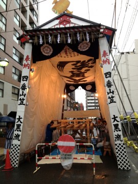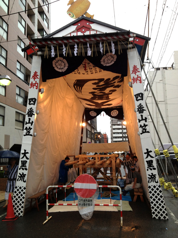 大黒流は、本日棒締めを行うため、朝9時から山笠台に舁き棒を据えて準備を行っていました。飾り付けは明日4日に行う予定です。