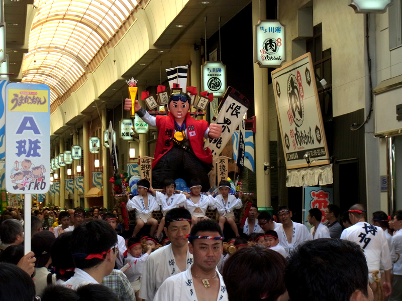 子供山笠はそのまま上川端商店街の中に舁き入れ、たくさんの買い物客の応援を受けながらアーケードを走り抜けました。