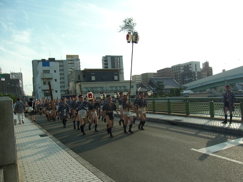17時30分、一番山笠の千代流が力強い「オッショイ!」の掛け声高らかに石堂橋をスタート。