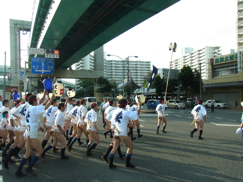 「オッショイ!」「オイサ!」の声を響かせながら、次々と櫛田神社の境内に入り、参拝を行いお汐井取り終了。再び掛け声の中、自分たちの町に戻っていきました。