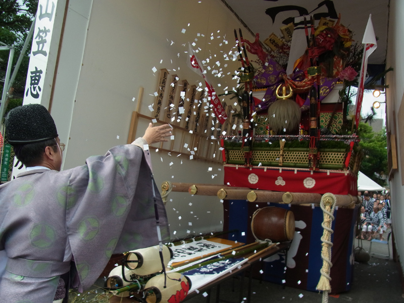 昨日7月7日(日)、前日に飾り付けを終えた恵比須流・土居流・西流が御神入れの儀式を執り行いました。これにて、全ての舁き山が博多の町に建ったという事になります。