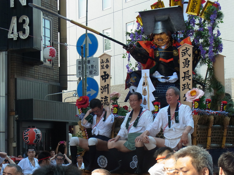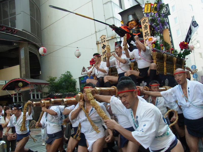 午後4時。初夏の厳しい日差しの下、中洲流が手一本を入れ、今年最初の山舁きがスタート。長槍を突き出した黒田長政の迫力ある人形が、中洲の町を走り抜けていきます。