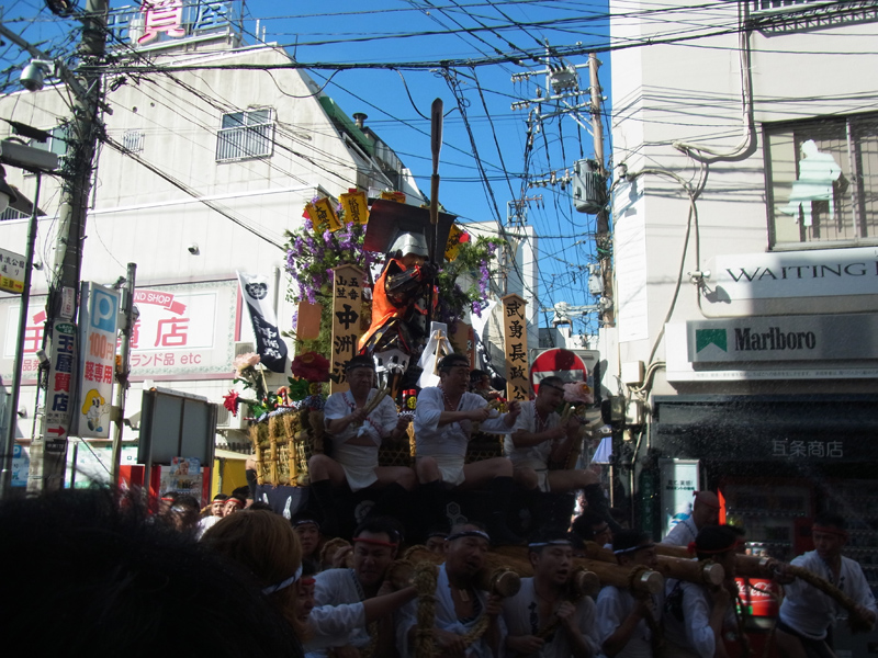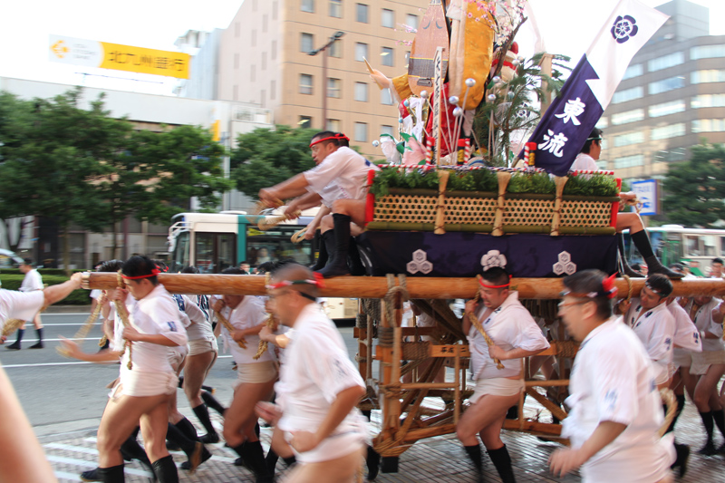 午後5時、西流がスタート。山小屋を出た蘭陵王を乗せた舁き山が櫛田神社前を駆け抜けていきます。
