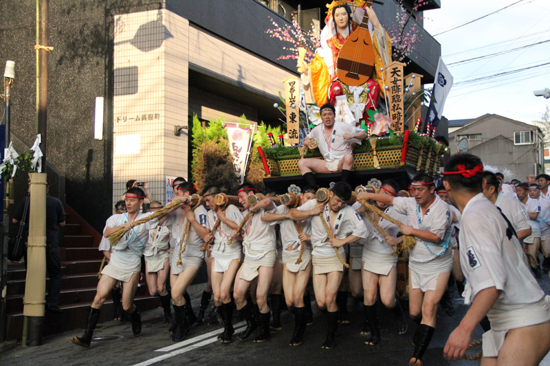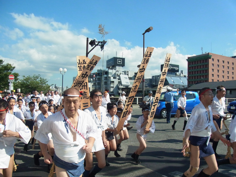 流舁きの先陣を切るのは、午後4時から舁き出しを行う中洲流と千代流です。