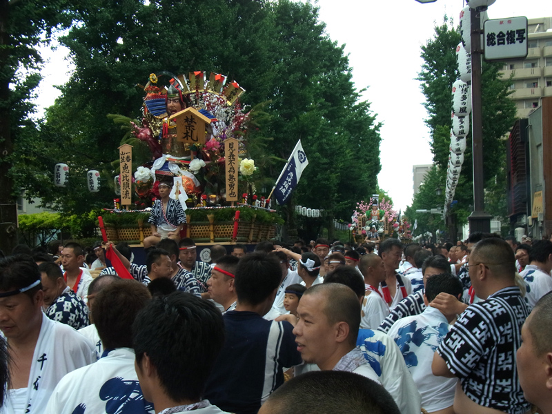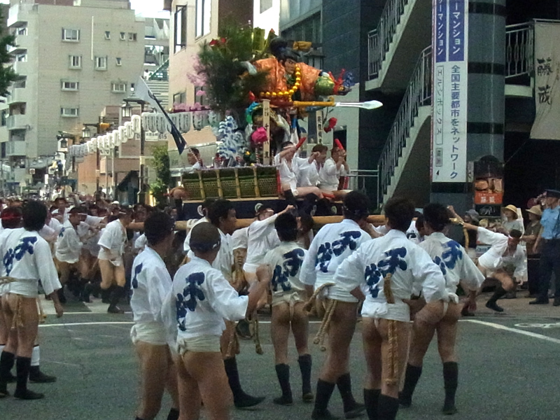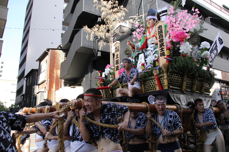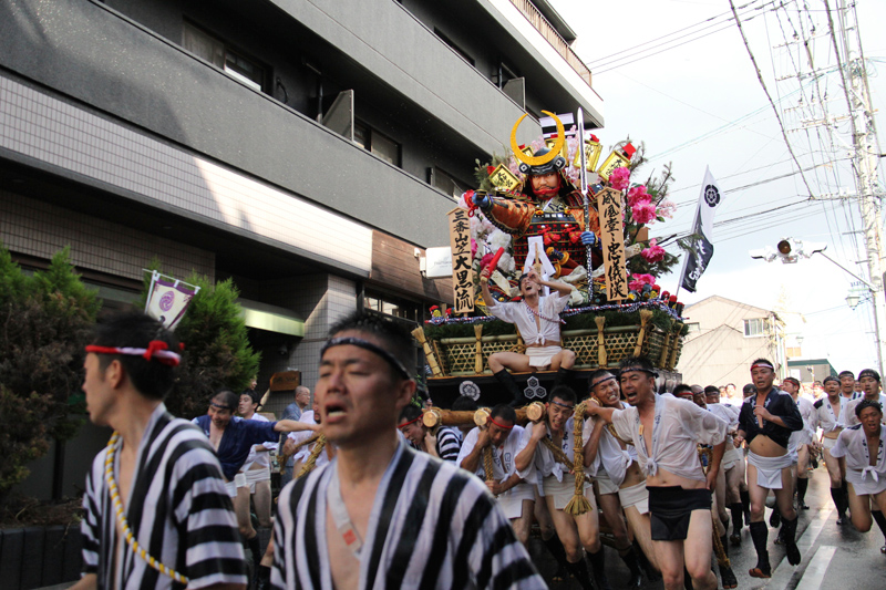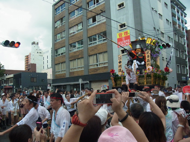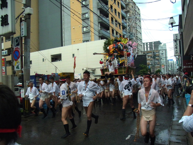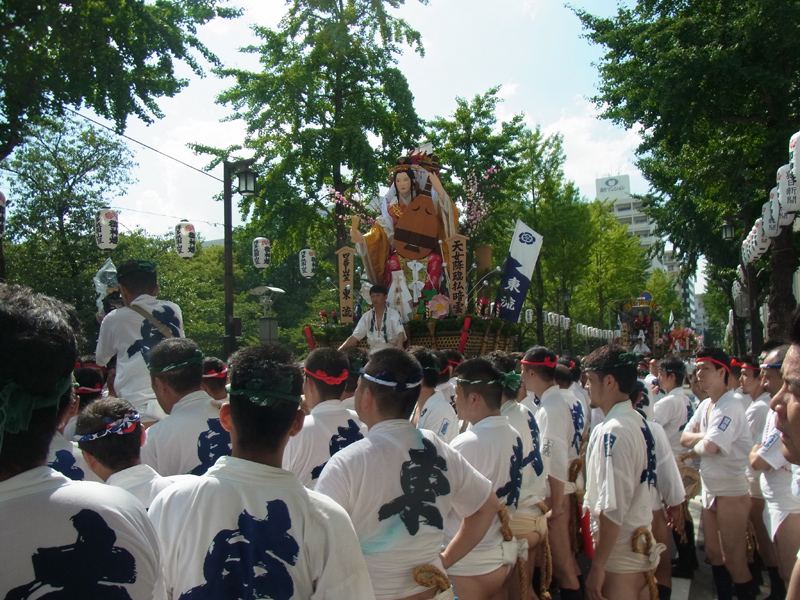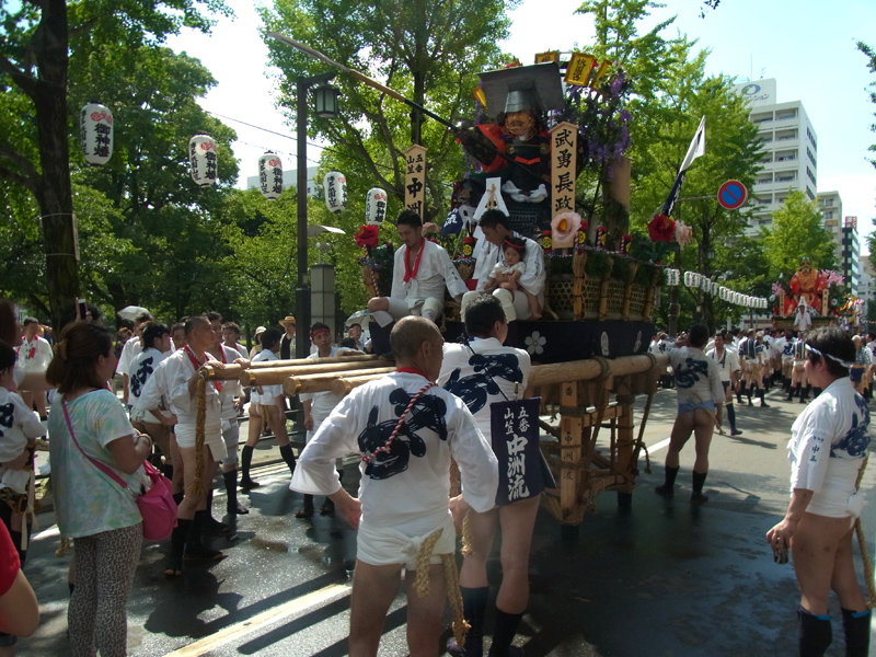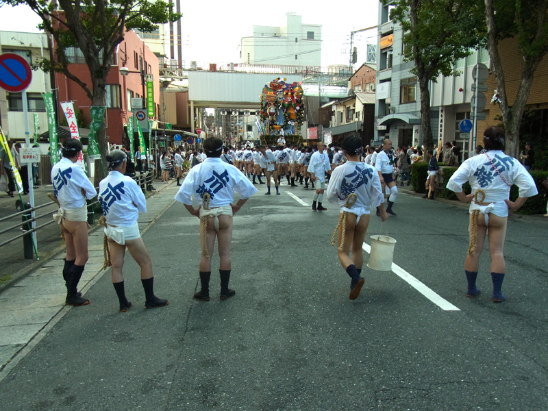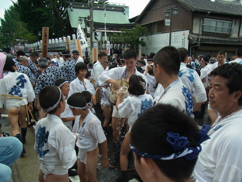 櫛田神社から冷泉公園にかけて山列入りした舁き山の周辺では、水を掛けたり飲んだり、記念写真を撮ったりする舁き手の姿が見ることが出来ました。この日は最高気温32度。とても暑い一日でした。