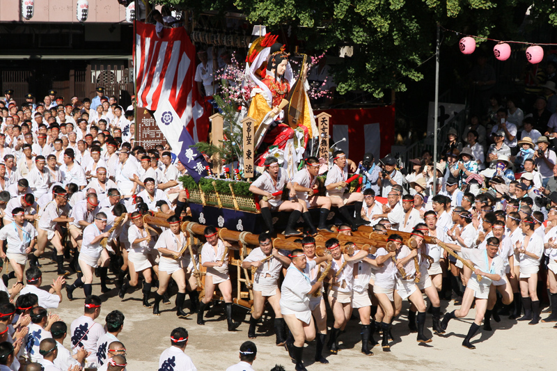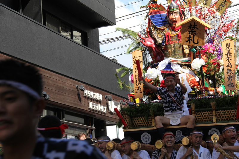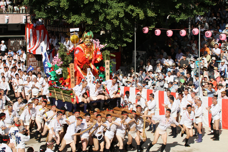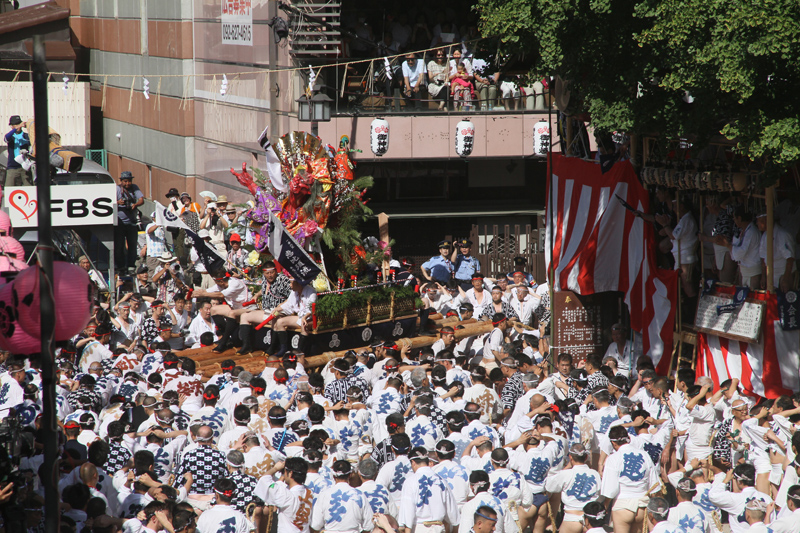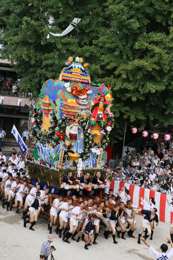七流が櫛田入りを終えると、最後に「走る飾り山」八番山・上川端通がその巨体を揺らしながら櫛田神社に。巨大な飾り山が人の手によって担がれて旗をぐるりと回るその圧巻の光景に、見物客からは感嘆の声が上がります。