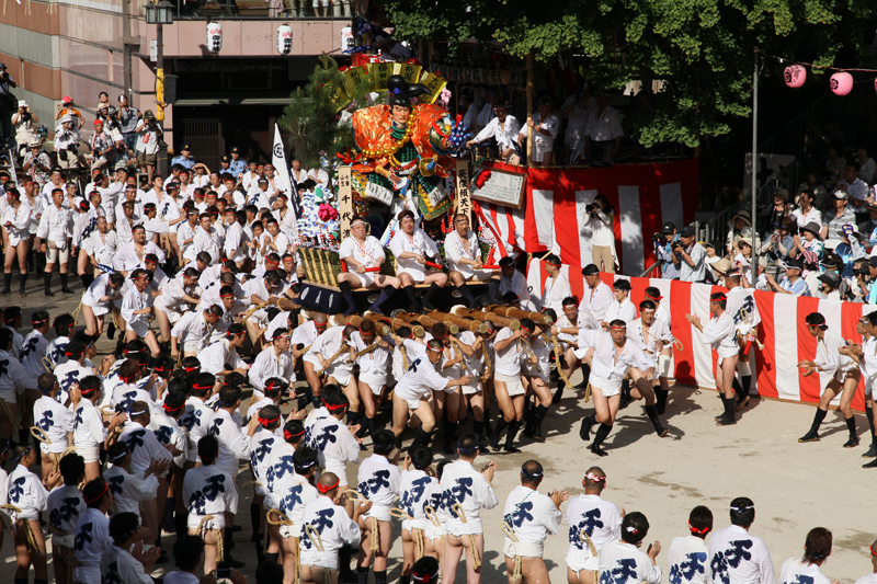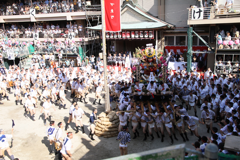 午後3時59分。棒鼻をカウントに合わせ叩く手が、カウントゼロを刻んだ瞬間、太鼓の音が。一番山・恵比須流がどっと櫛田神社になだれ込んでいきます。清道旗を一周し、そして舞台前に据えられます。一番山だけが許される『祝いめでた』の清祥です。舁き手、そして桟敷席の人全てが手をうちながら斉唱。