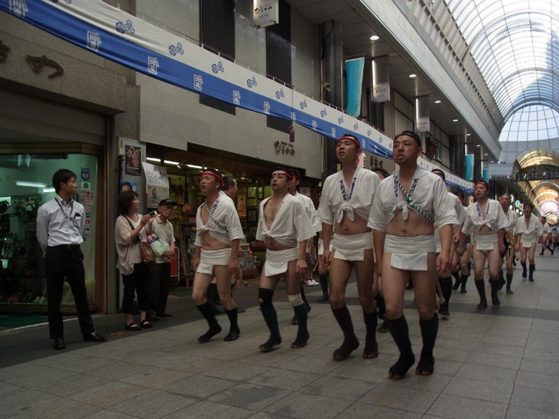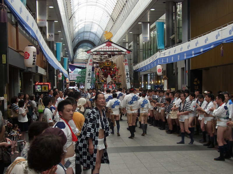 朝山が終わった10時間後、博多の町に再び山笠の熱が戻ってきます。 11日の夕方、中洲流、千代流、大黒流、東流で『他流舁き』が行われました。自分たちの流区域外に出て山を舁くことでお互いに敬意を表す、いわば「陣中見舞い」的な意味合いの強い行事です。
