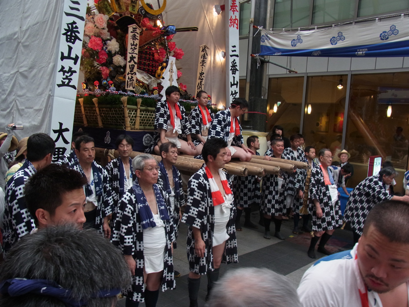 夕方5時、上川端商店街に建てられた山小屋を舁き出す大黒流。