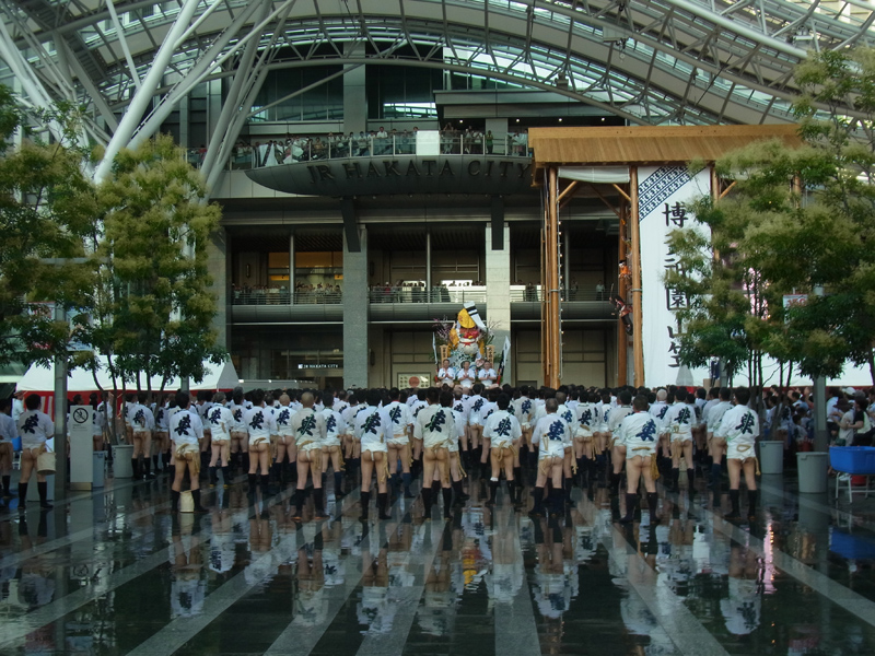 東流は、櫛田入りを行った後、JR博多駅へ毎年恒例の表敬訪問を行いました。沢山の見物客の中、手一本を入れて再び自分たちの流区域に戻っていきました。