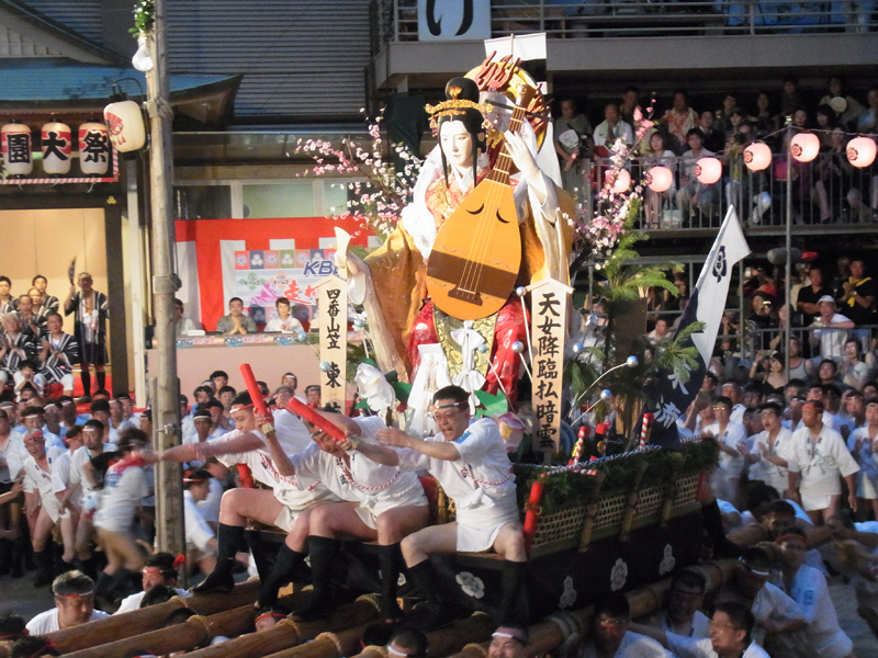 七流の舁き山が櫛田入りを終えた後は、八番山・上川端通の「走る飾り山」が、清道に登場します。