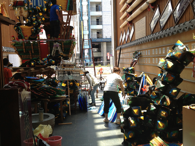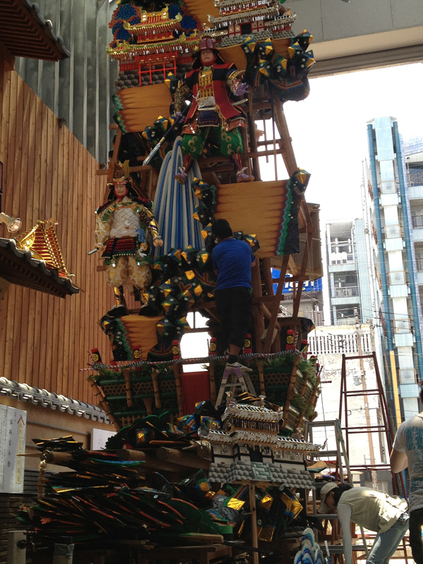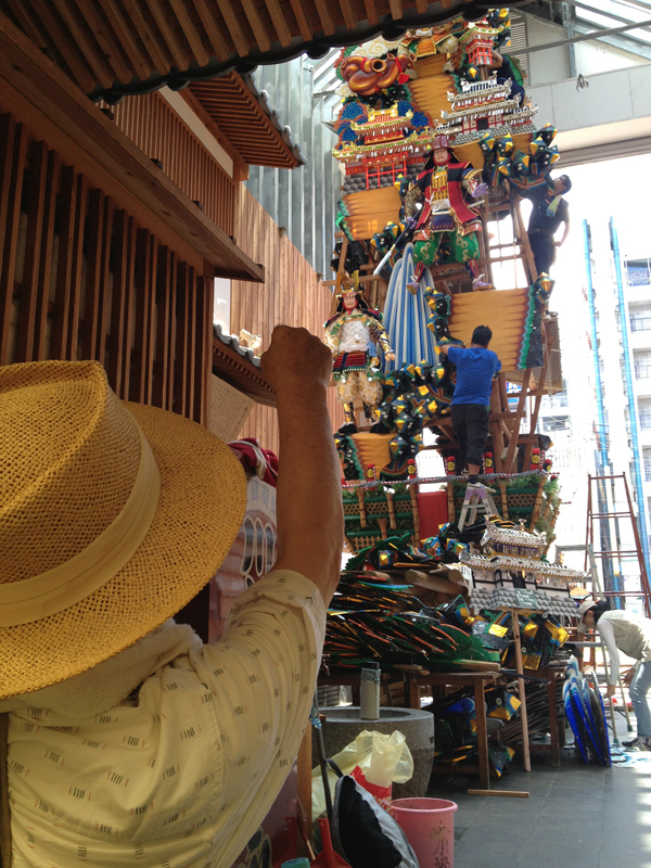 今年は折りしの猛暑。ちょっとした風はあるものの、人形師や山大工、流の方々も大汗を流しながらの飾り付けとなりました。