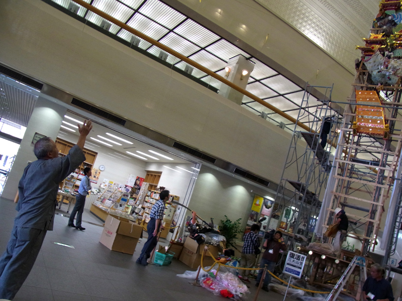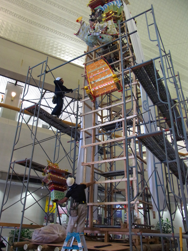 現在の飾り山と違い、明治時代の舁き山の矢切り(山の骨組み)は真っ直ぐで少し細いため、人形師の方達は通常の飾り山の制作と微妙な感覚のずれを調節し確認し合いながら、山大工に指示を送って飾り付けを行います。