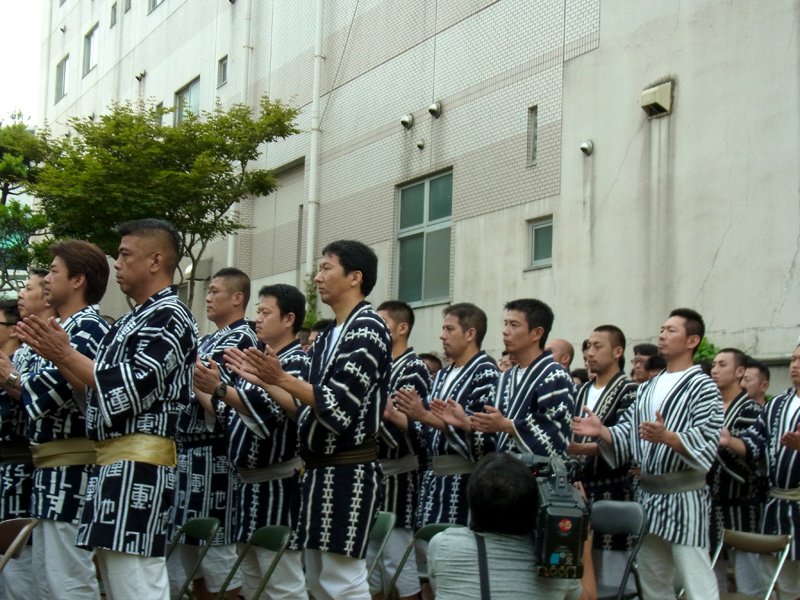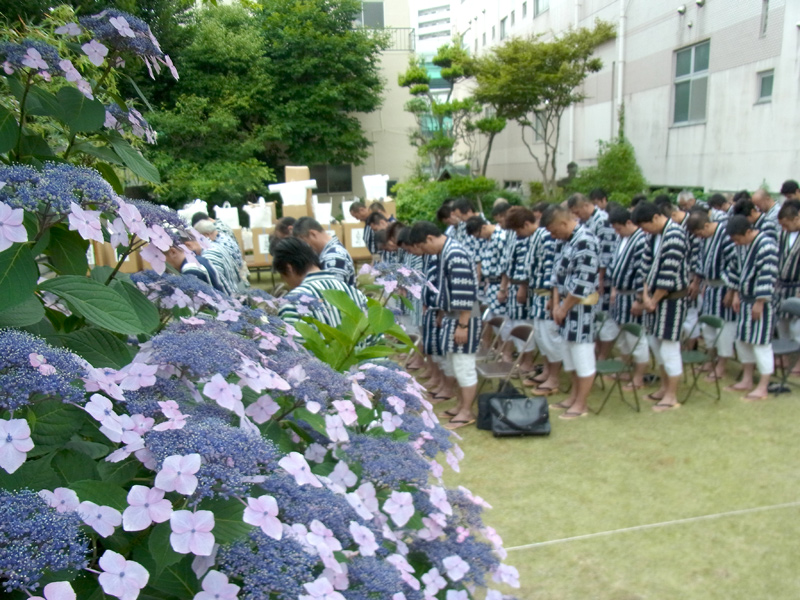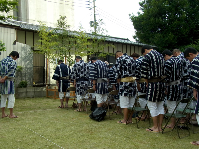 今年は個人宅の庭先での注連下ろしとなり、地面は山笠では珍しい芝生の上。緑の絨毯の上に揃う長法被は珍しい光景です。