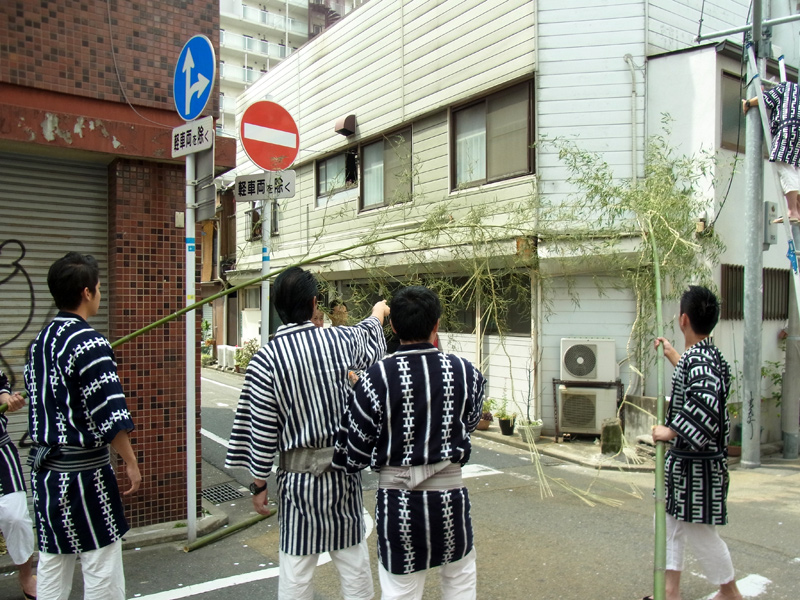 儀式の後、下竪町の人達が、祓い清めた道の出入り口に注連縄を張った笹竹を立てて、この場を神域化しました。