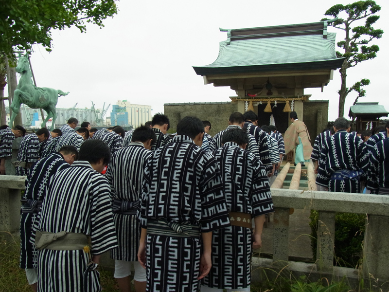 この日の棒洗いは、まずは恵比須流。 朝9時からの神事開始のため、男衆が早い時間から櫛田神社浜宮に集まりました。