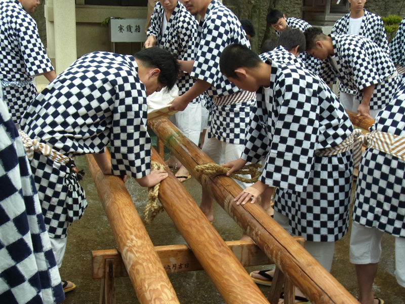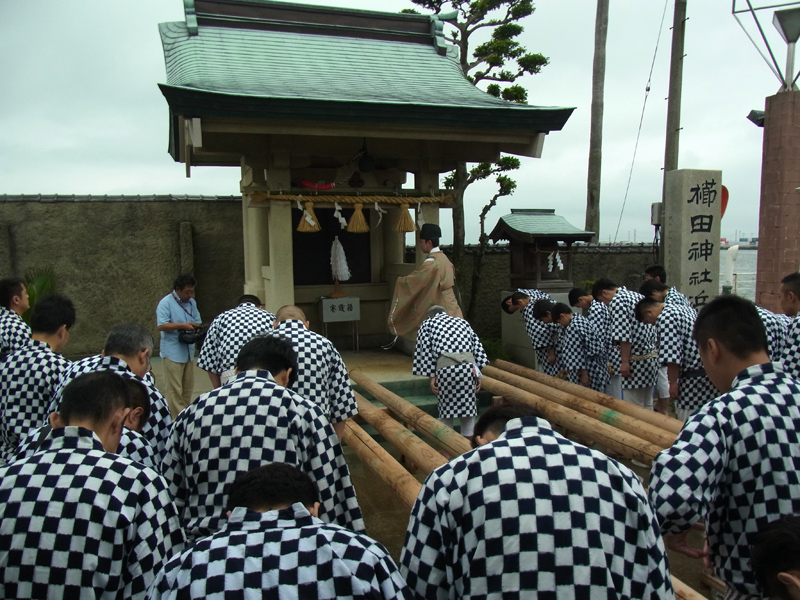 10時から神事が開始。 汲み上げた潮を舁き棒にかけて洗い浄め、最後は真水で丁寧にすすぎ上げます。