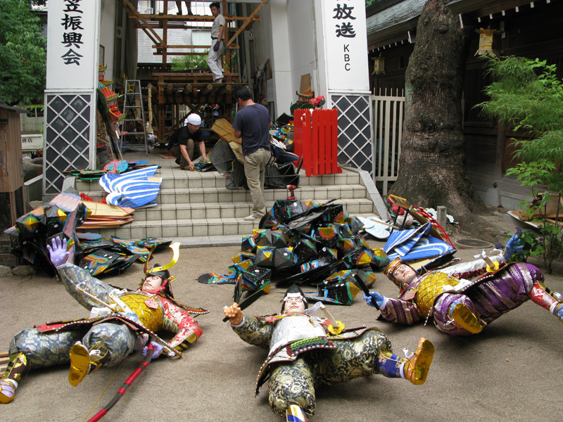 本日6月10日の早朝、櫛田神社に常設展示されている飾り山が、本年度の飾り山の準備のため山解きが行われました。
