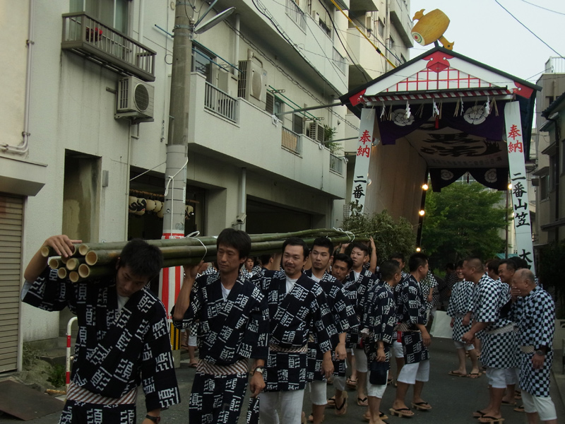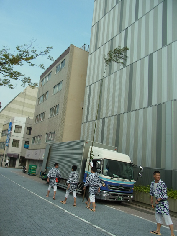 注連下ろしが終わる頃、各町の若手の方が山小屋まで足を運び、お祓いした笹竹をもらって各町に戻っていきます。この笹竹を各町の町境に立てます。