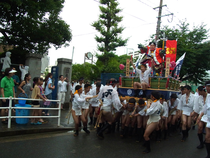 千代流は午後4時に千代小学校校門からスタート。地域の人達や女生徒がたっぷり勢水を掛けていきます。