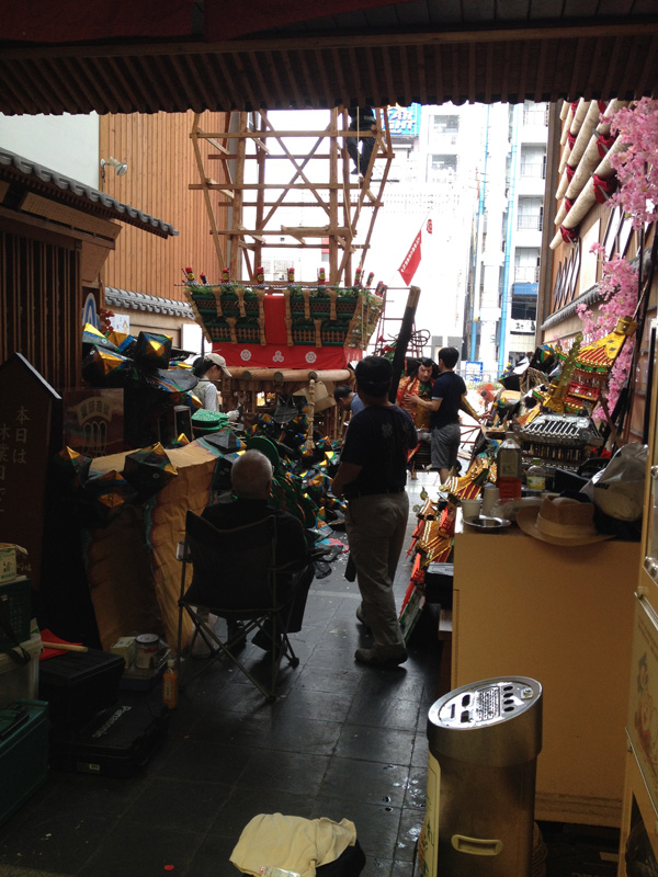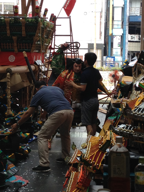 追い山が終わって3日。本日18日、上川端商店街にある川端ぜんざい広場にて今年の八番山・上川端通の飾山の飾り付けが行われました。