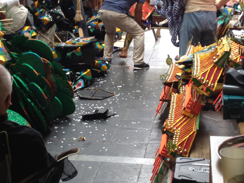床には、今年大喝采を受けた見送り「花咲爺」で舞い散った紙吹雪の残りが落ちていました。