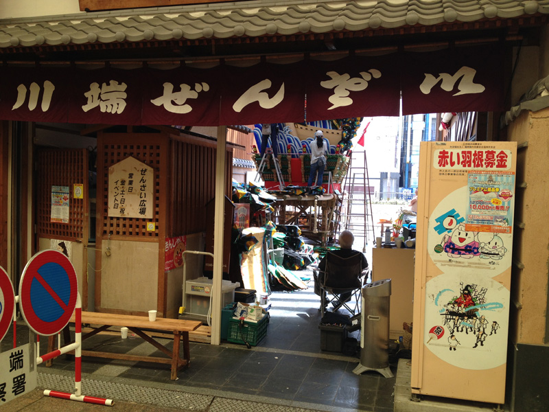 18日の朝8時、人気がまだ少ない上川端商店街。川端ぜんざい広場から、田中比呂志さんの声が響きます。まずは人形の据え付けから。