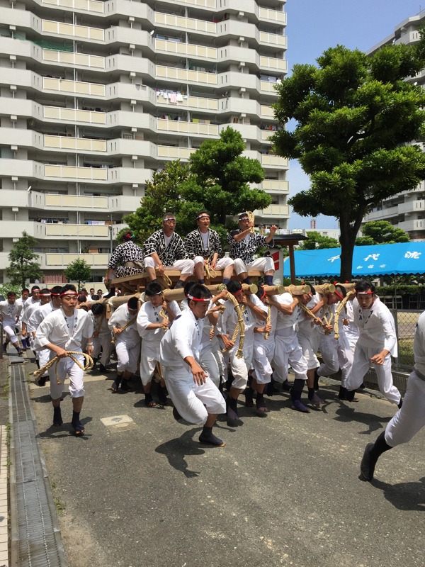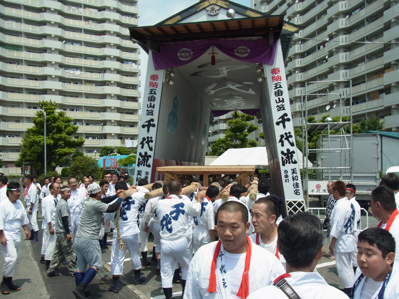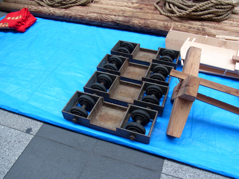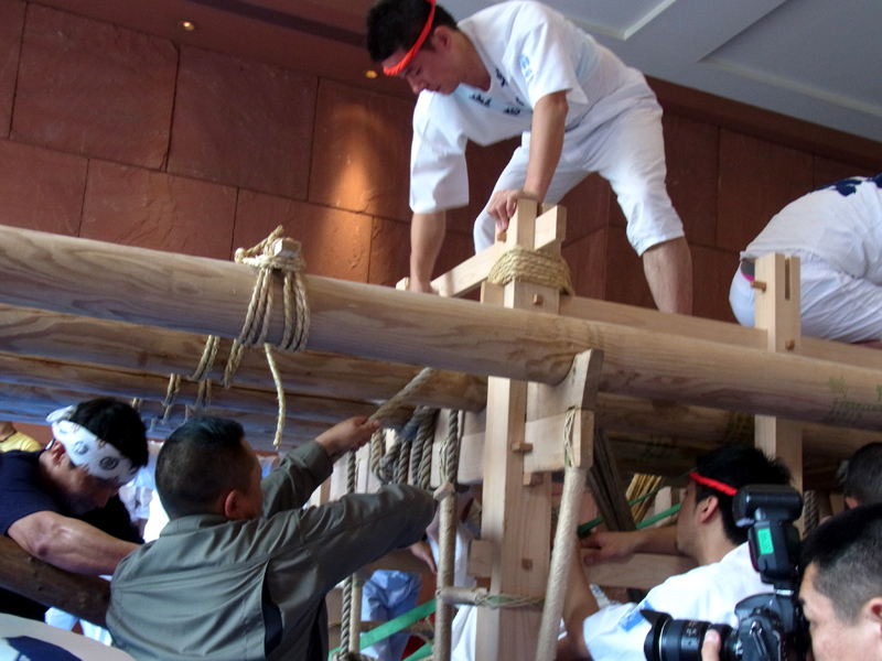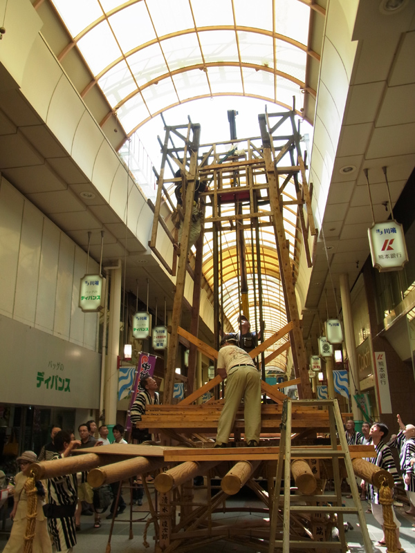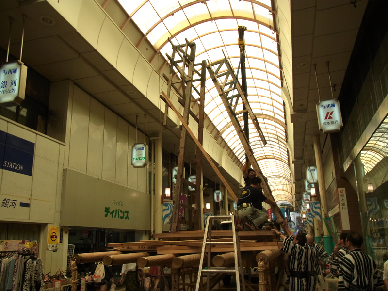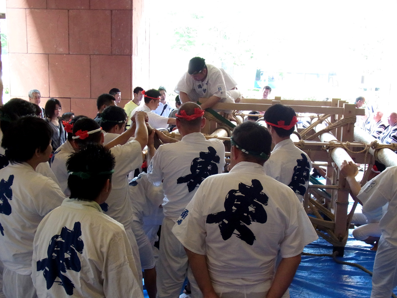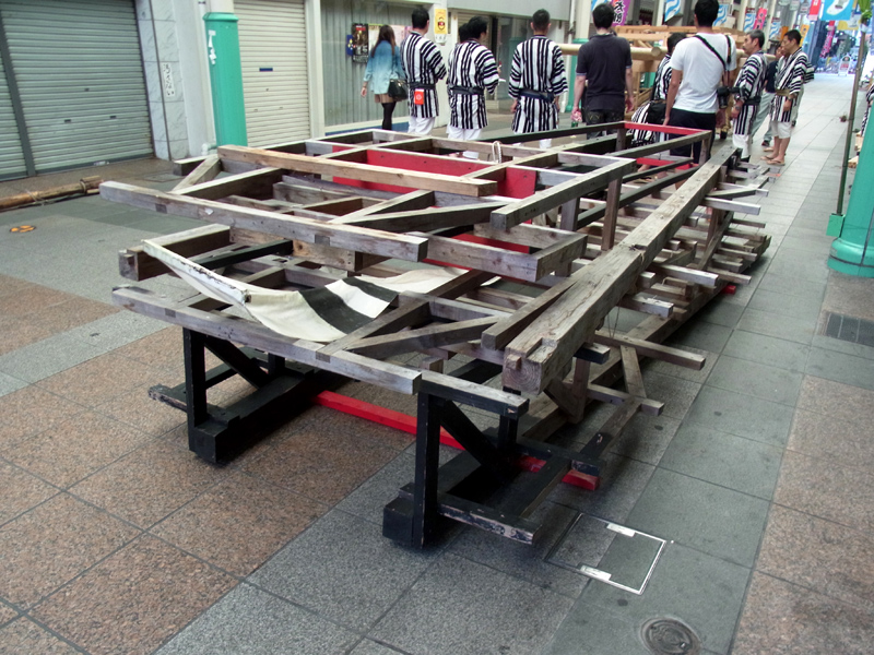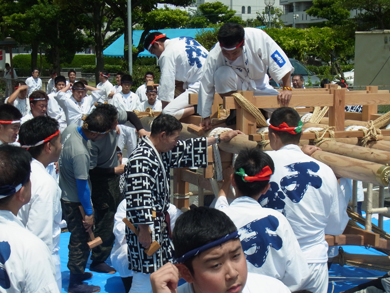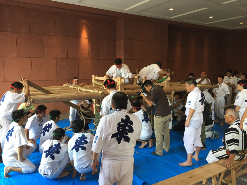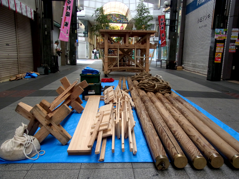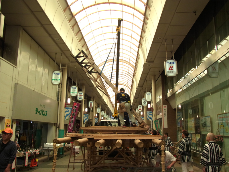 午後より、八番山の特徴でもある伸縮型の特製矢切(飾山の骨組み)の組み立てが始まりました。