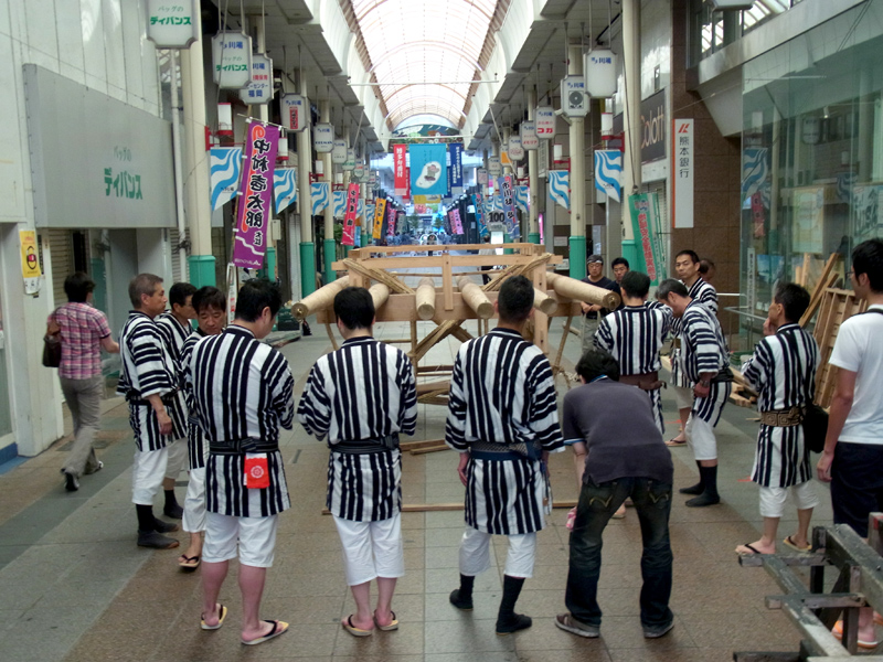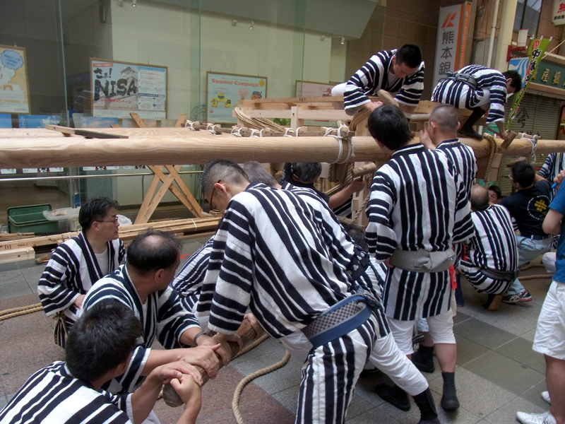 上川端商店街の博多リバレイン側に建てられる川端中央街の小屋入りが午前9時より行われました。