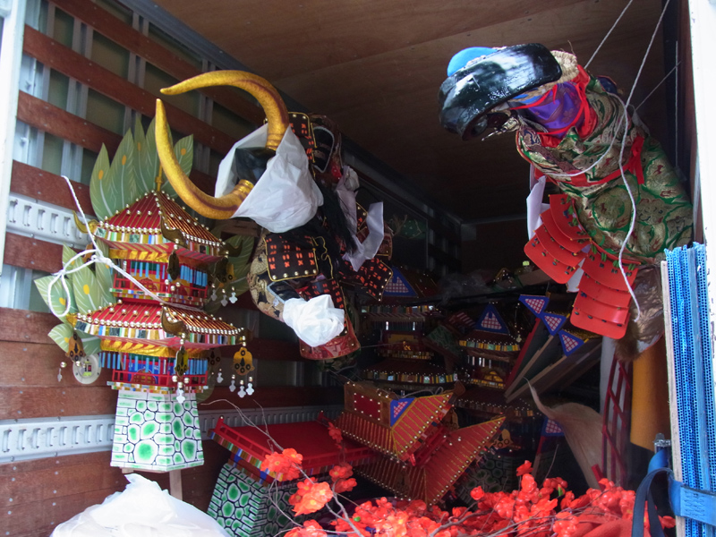 天気は生憎の曇り空。時折雨粒がぽつりと落ちてくる不安定な天気の下、搬入した今年の飾りをトラックから次々と降ろしていきます。