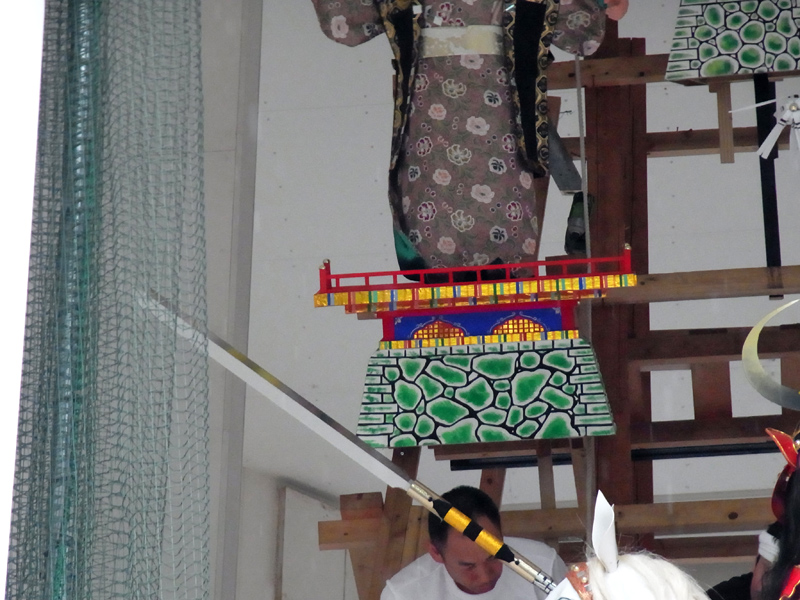 飾山は下から見上げて見物するので、見上げた時の見た目がとても大事。下から見上げて日本号の刃先がギラリと輝くベストな角度を細かく指示していきます。最後に山小屋内の照明を付けて刃先の光り具合を確認します。