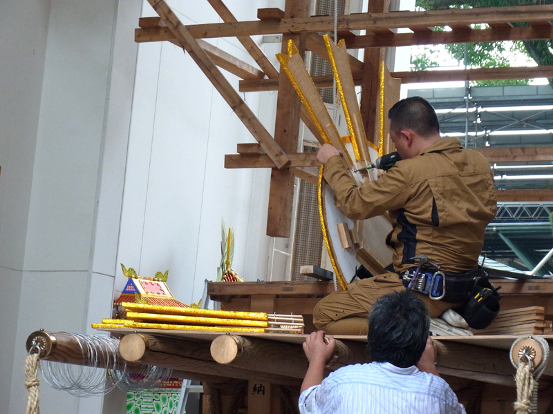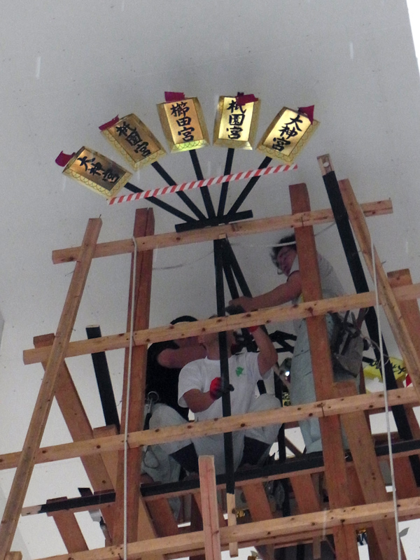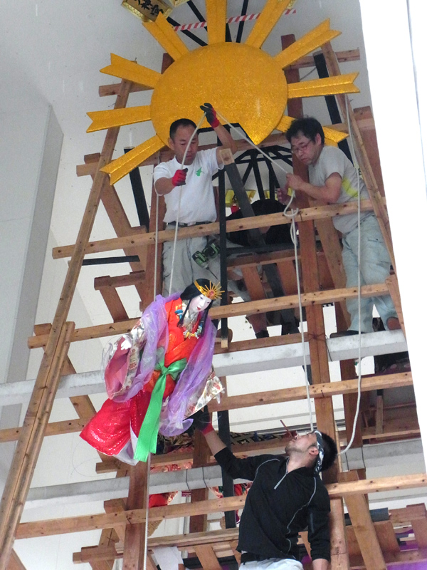 天照大神を飾るため、太陽のパーツを組む山大工。その後、人形と共に素山に引き上げられ、飾り付けられました。