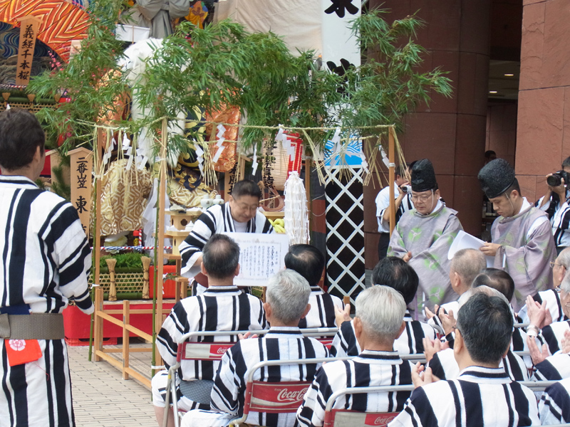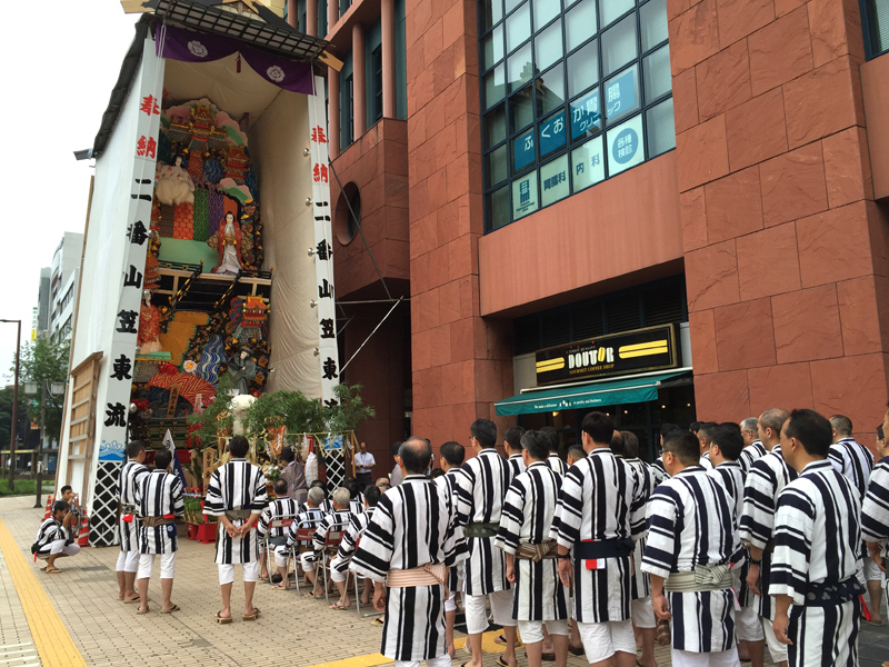 本日7日6日、呉服町交差点沿いにある東流が山小屋前にて、舁山と飾山の御神入れ神事が執り行われました。