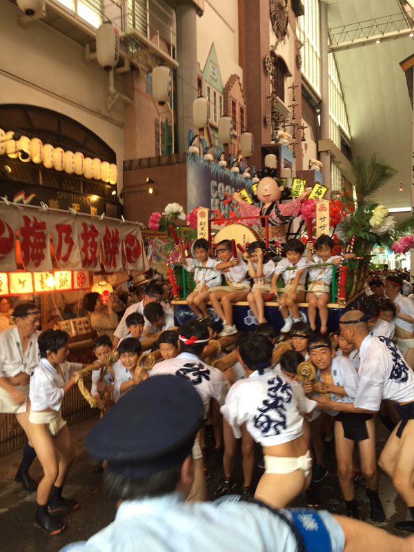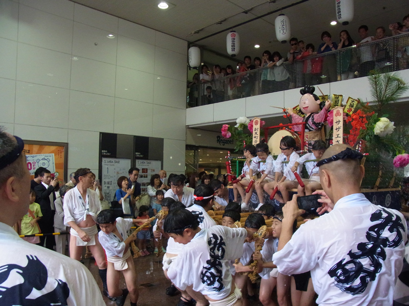 子供山は新天町商店街の道路を始め、ソラリアステージの通路や岩田屋等を元気に舁き周ります。