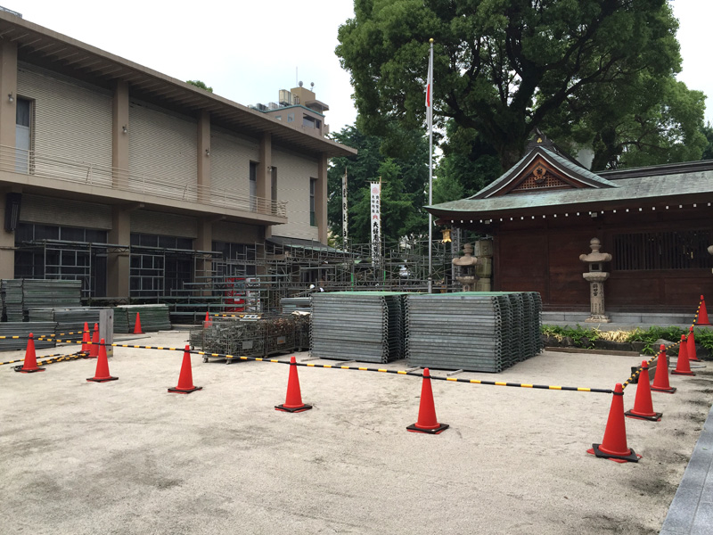 櫛田神社の桟敷席の建設が始まりました。昨日の朝の時点(上の写真)では、鯉のぼりを片づけていたのですが、今朝の櫛田神社では資材が運び込まれ、まずは清道真っ正面の「あ」席方面から建設が始まっていました。
