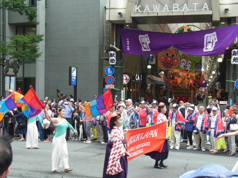 午前10時から明治通りでは「インターナショナル・パレード」がスタート。国際大会の開幕を彩りました。川端中央街の飾り山の横をパレードが華やかに進んでいきます。