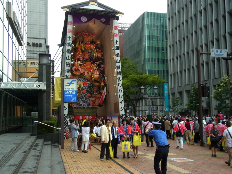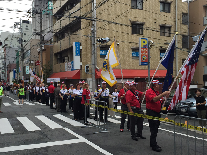 明治通り沿いにある博多リバレインの飾り山の横を通過するライオンズクラブのパレード。
