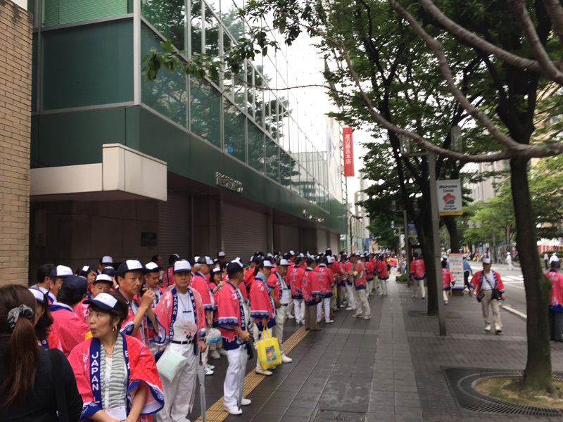 冷泉公園はパレードの待機場所でしたが、博多どんたく港まつりの時以上の大混雑ぶり。裏道や呉服町交差点近くもパレードに参加される人で混雑していました。世界各国から参加しているだけあって、違う国同士の人達で記念写真を撮影する様子も見られました。