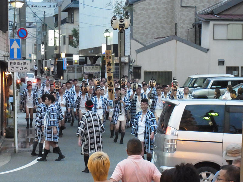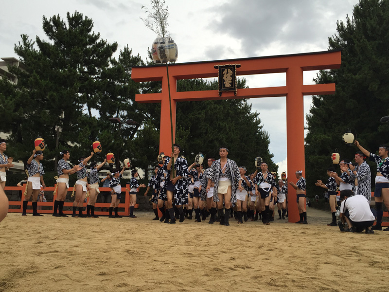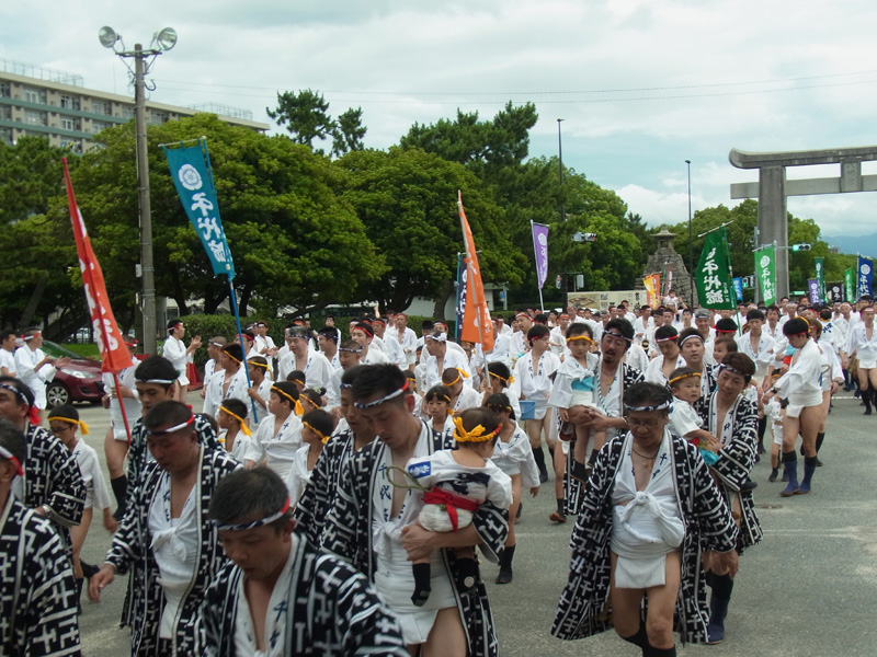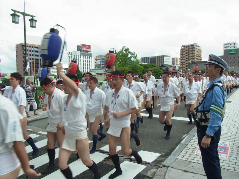 御神入れや子供山笠が行われた7月1日の夕方5時半より、当番町によるお汐井取りが行われました。お汐井取りとは、山笠の安全を祈願して舁き手が箱崎浜に清めの真砂を取りに行く行事で、本日は各流の当番町らが箱崎浜まで向かいます。今年最初の威勢のいい「オッショイ」の声が博多に響き渡りました。