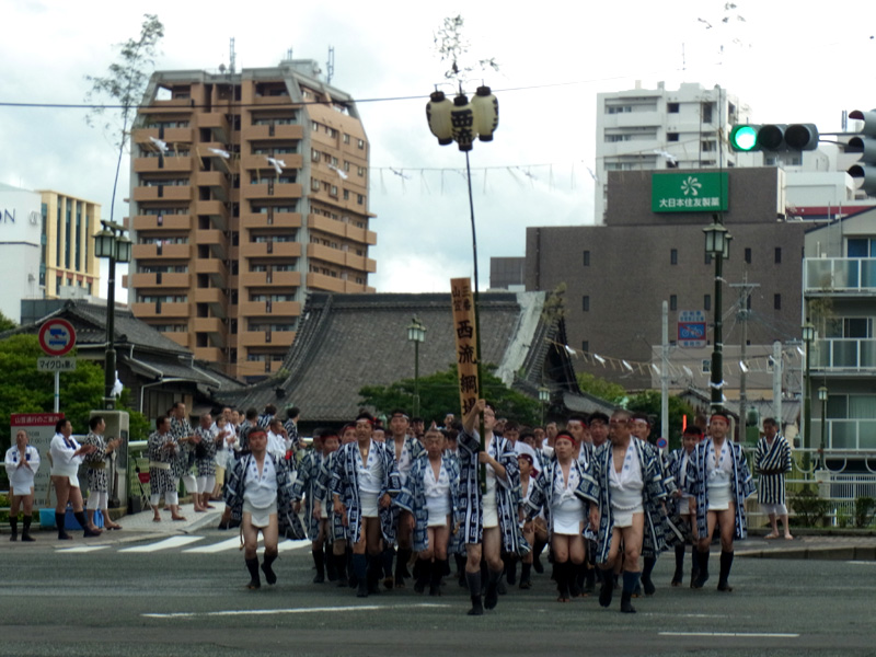朝の快晴はどこへ行ったやら、午後3時からの豪雨の影響で曇天模様となった今年の当番町お汐井取り。夕方5時25分、お汐井取りのスタート地点である石堂橋に今年の一番山・東流がオッショイの声を響かせながら到着しました。