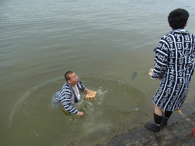「ちゃんと潜って取りぃや」と笑いながら言われ、潜ってお汐井枡で海底から砂を取ろうとしてもなかなか取れず、砂浜の人達の笑いを誘っていました。