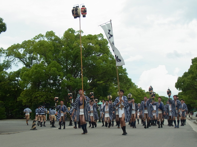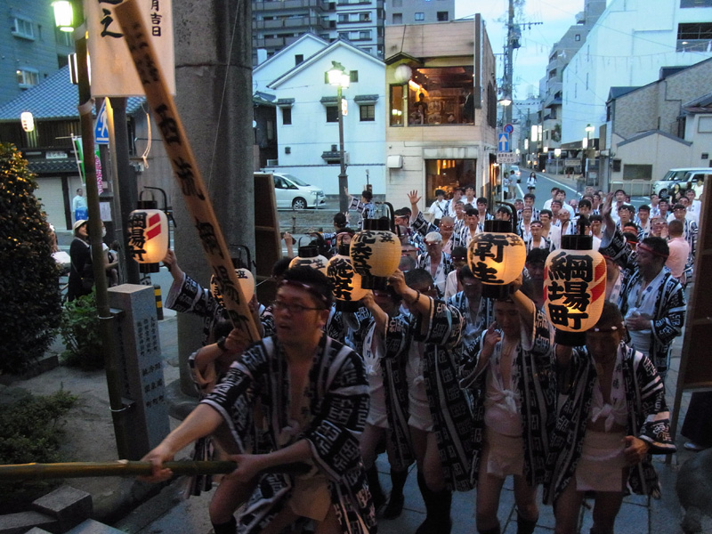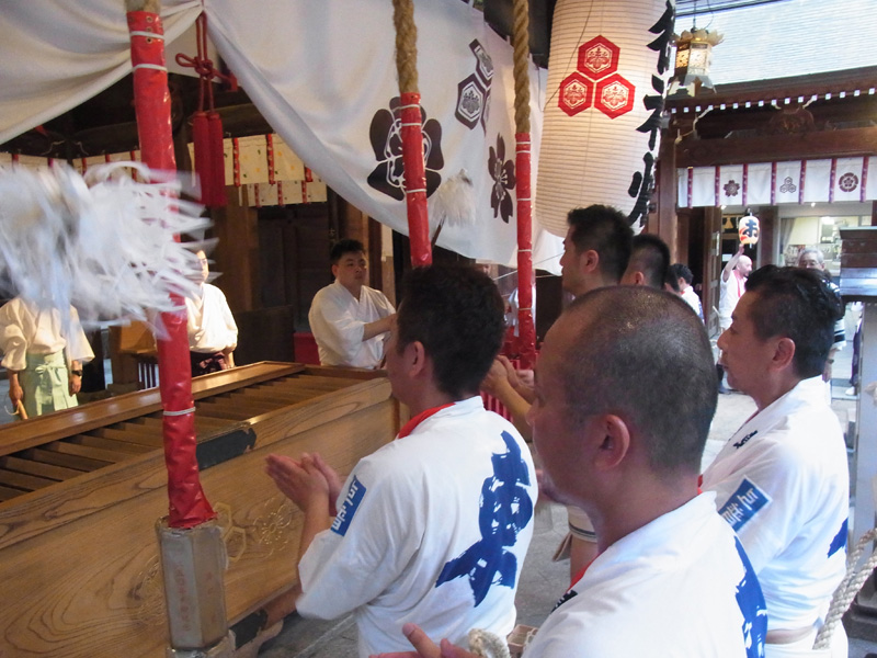 男衆は、今度は箱崎浜から櫛田神社を目指してお汐井道を戻ります。太鼓の音と共に山門から入った男衆は、柏手を打ち山笠行事の安全と無事を祈り、そして再び走って自分たちの流に戻っていきました。
