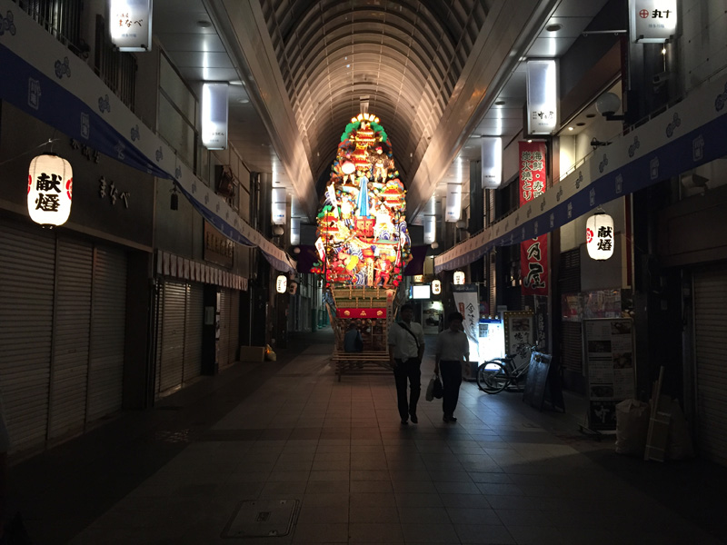 これを撮影したのは6月30日の23時45分。川端中央街の飾り山には夜警の方が詰めていました。こうやって静かに7月1日がやってきます。